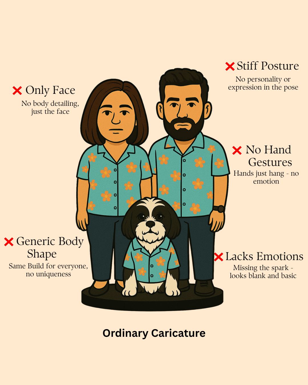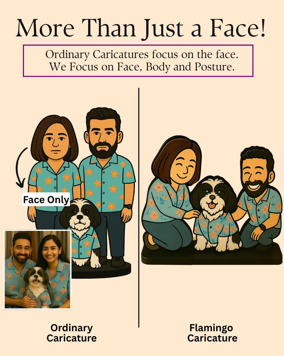 Keep your love and joy alive in a special way β€” order your Flamingo caricature with pets and two people today.